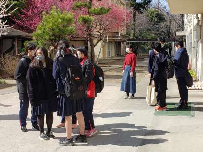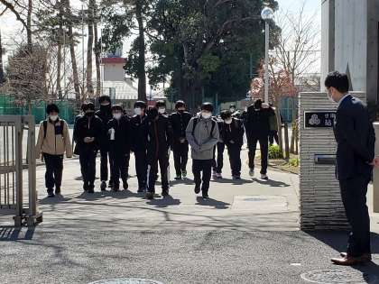 生徒たちが一斉に下校する際は、教員がポイントポイントに立って見守りをします。帰宅途中でのマナーも伝えながら。もちろん明日へ向けての励ましメッセージも込めています。