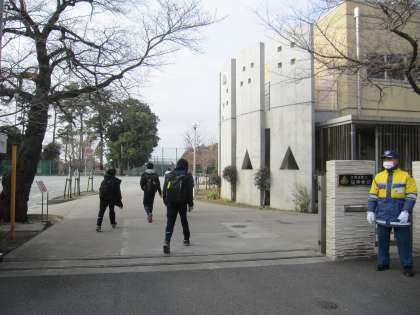 おはようございます。この季節は寒暖差や花粉症で体調を崩す人も多いようですが、今日は風もなく、気温も昨日より高めで過ごしやすいようですね。正門では、いつも警備員が見守りをしています。