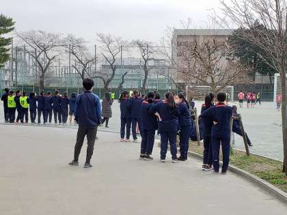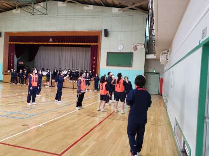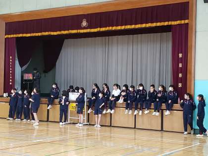自分たちの試合が終わった生徒は、応援に回ります。応援の数が多くなると自然と試合も熱を帯びてきます。ゴール後のパフォーマンスも応援を意識して派手になってきましたね。体育館での女子のバスケットボール、見事得点の瞬間です。