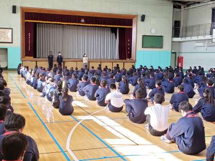 1年生は体育館で学年集会。学級委員を中心に生徒主体で企画・運営したスポーツ大会。今年度初めての学年単独行事を自分たちの力だけで実施できたことは今後に繋がる大きな成果です。1年生の表情も変わってきたように思いました。