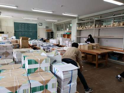 新しい教科書が届きました。教務部の担当者で搬入、仕分け作業を行っています。1年前は分散登校日での配布となりましたが、4月は予定通り6日以降に配布できそうです。今週中には整理を完了して始業式を待ちます。