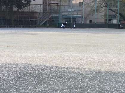 桜吹雪の中、部活動の生徒が準備に取りかかっています。今日も春らしい陽気となりそうです。