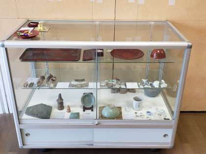 ミニ博物館コーナーもあります。社会科教員を中心に企画した展示です。歴史的な遺産をテーマに応じて紹介しています。現在多目的ホールでの展示は、2年生校外学習に合わせて「鎌倉」特集となっています。