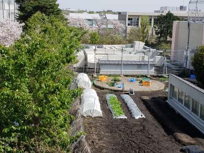 砧中学校の屋上。そこには農園があります。農業部の生徒たちの活動拠点。季節に応じて様々な農作物を収穫しています。全国農業コンクールで何度も受賞実績のある農業部(2年前はグランプリも受賞)。緑豊な砧中学校の一風景です。