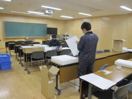 砧中学校では、今年度も給食の時間はパーテーションを使用します。新入生のパーテーション配布の準備も整いました。(副校長)