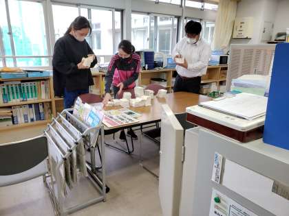 明日の入学式、参列する在校生は代表者のみ。従いまして実際は8日からの教育活動開始となります。教育活動開始に向けて校内各所で準備が着々と進められています。配布予定の生徒手帳の数を確認したり、リモート活動の打ち合わせをしたり。まだ全校生徒が一堂に会することはできませんので、8日の対面式もリモートで実施予定です。そして新しい体制となった給食室も今日は事前に試作・試食を行いました。2・3年生は8日から給食開始です。