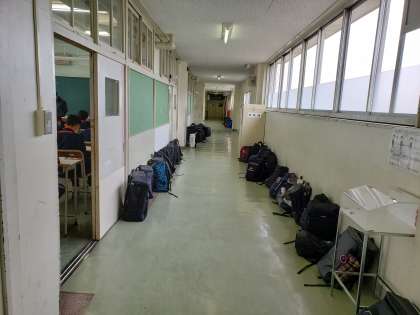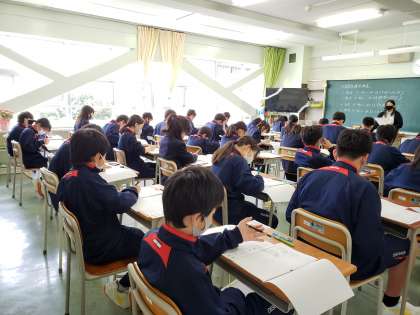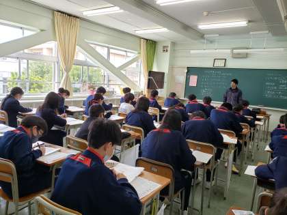 1年生の試験中の様子です。まだ入学して一週間ですが、試験を受ける姿勢に既に規律が見られました。真剣に問題に向き合っています。もうすっかり砧中生です。