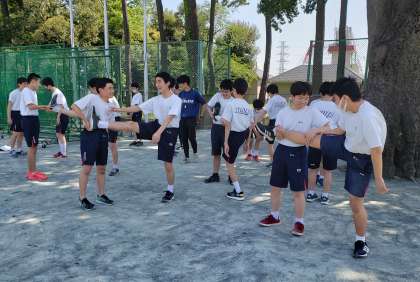 体育では生徒同士でストレッチを念入りに行っています。3年生になると体の自己管理の重要性も認識しています。