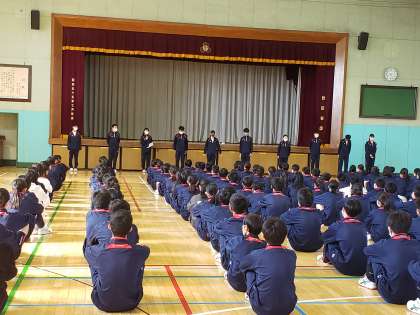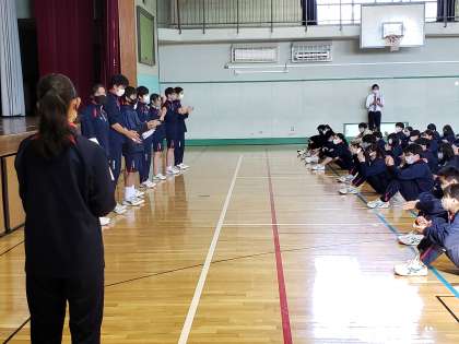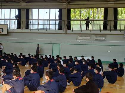 体育館で3年生の学年集会が行われています。企画・運営を全て生徒が主体となって行っています。過去2年間の積み重ねの成果が見られました。前期の各委員の紹介ならびに決意表明です。まだ緊急事態宣言発令後の動向が見通せませんが、今やるべき事をきちんとやっていこうというメッセージが伝わってきました。
