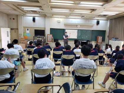 1年生音楽。これから砧中校歌を学習します。その前に出身小学校の校歌を紹介するようです。様々な校歌に共通する歌詞などを知ることも大切ですね。