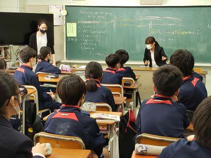 2年生英語。ALTによるクイズやゲームで楽しみながら英語を学んでいます。2年生になるとALTが話している内容はほぼ理解できるようで所々で笑いも起きています。