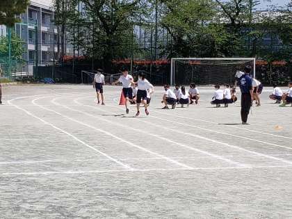 3年生体育。運動会に向けての全員リレー練習でした。力強い走りやスムーズなバトンパスなどさすが3年生です。この取り組みは男女共修の一環となります。