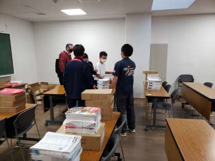 5校時に配布する教材を受け取りに来た生徒たち。昼休み中もお仕事に取り組んでくれています。