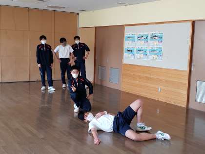 多目的ホールでの姿。「何をしているの?」尋ねてみると、「体育で習った柔道受け身の復習です」。怪我しないようにね。