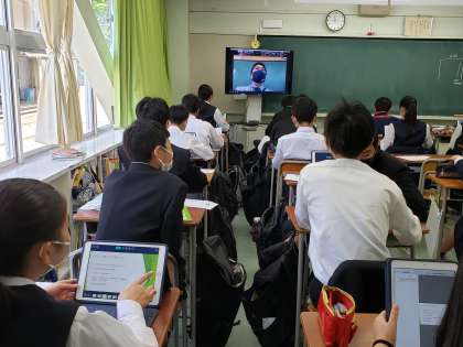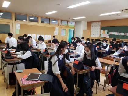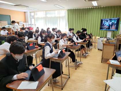 ロイロノートを使っての双方向のやり取りが始まりました。うまく送信できた生徒、戸惑う生徒とそれぞれですが、空いている教員がサポートに走り回っています。まずは全員が繋がることが大切ですね。焦らずにいきましょう。