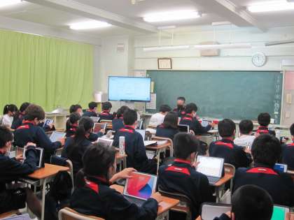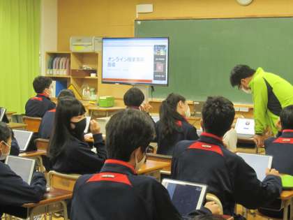 4校時は明日のオンライン授業に向けての事前説明会の様子です。Zoom を活用して、ICT担当者が一斉授業を行い、課題の受け取り方などを確認しました。
