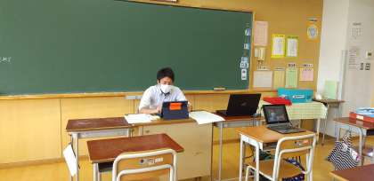 zoomに入れないなどの相談は電話やロイロノートで受け付けています。名前の表示を学年、クラス、番号、苗字にするよう伝えています。(副校長)