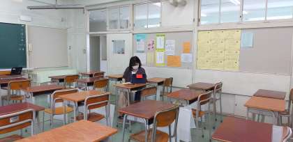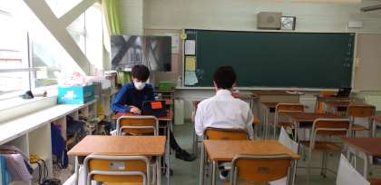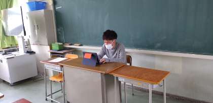 2年生は学級担任による学活を行っています。授業の感想などを発表しあったりしました。生徒の皆さんの声が聞けて、教員も安心していました。しかし、音声でのやり取りができなかったクラスがあり、文字でのやり取りに切り替える場面もありました。
