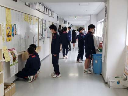 学校生活では欠かすことのできない昼休み。職員室前廊下では生徒会掲示板を見入ったり、部活動掲示板に記入したりと生徒たちが集まってきます。この場所は生徒にとって貴重な情報収集の場となっているようです。