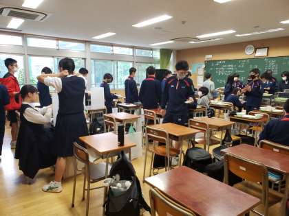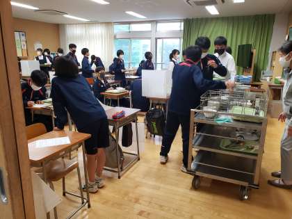 普段の給食風景は配膳時か食事中の様子ですが、今日は片付け場面を紹介します。順番に並んで食器を返却しながら併せてパーテーションも片付けていきます。昼休みはできるだけ早く遊びに行きたいところですが、落ち着いて行動できています。牛乳の紙パック回収など作業行程が昨年度から増えましたが、食器なども丁寧に扱っています。