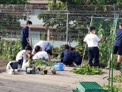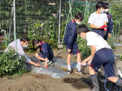 農業部、本日は有志によりトマトの植付け作業を行っています。地域の指導員の助言を受けながら、植付けの間隔などをメジャーで測っていました。