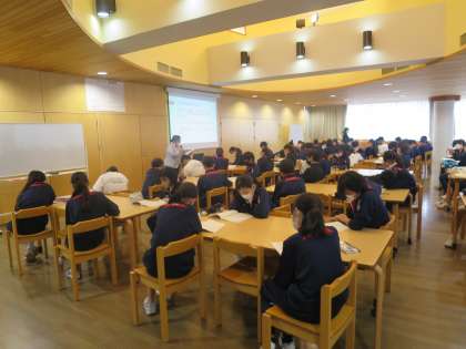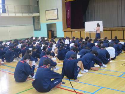 本日の1校時には、一昨日に引き続き2年生では3クラスずつ分かれて、合同でのキャリア教育、「上級学校について」と「職業と好きなことについて」の授業が行われました。中学校を卒業した後の進路や将来自分がやりたいこと、何のために働くのかなど、考え意見を共有していました。大事な自分自身の進路に関わることです。これからより深めていきたいですね。