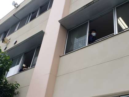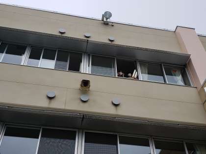 3年生の教室から、登校する生徒たちに声をかけ、手を振っています。こんな朝のお出迎えも元気が湧いてきますよね。気分は上々、今日一日がスタートしました。
