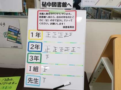 図書委員会で図書室利用状況調査を行っていました。入室前に所属学年などを確認しています。今日は2年生の利用が多いようですね。この結果を基に、今後のPRの仕方なども検討するそうです。まずは先生へのPRかな?