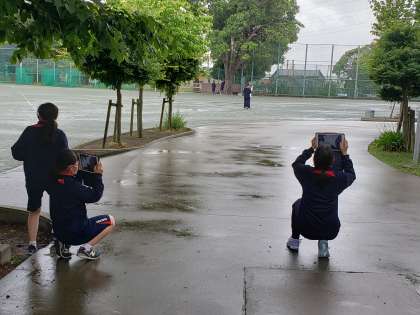 3年生が校庭でタブレットを使って、様々な写真を撮っていました。さて、これは何の授業でしょうか?