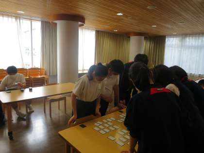 本日は部活動の時間に、I組百人一首部と日本文化部の数名で、百人一首の対決をしました。