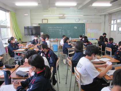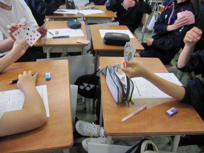 黒は+、赤は−と見て正負の数のたし算を行い5枚の数の合計が多い人が勝ちとなります。いつストップをかけると自分に有利になるのか頭の中でたし算をしながらタイミングを計っています。運と計算力の両方が求められますね。(副校長)