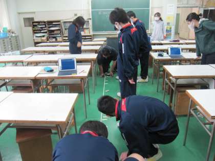 I組の社会です。地球誕生の45億年前から現在までを3mの巻き尺で表しています。最初の生物が誕生した時期などをその巻き尺上で表しています。人類の誕生は長い地球の歴史の中ではごく最近のこととしてとらえることができますね。