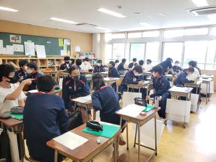 教室を移動して、それぞれの係で最初の打ち合わせが開かれました。係の担当教員が最初に概要を説明した後は、生徒たちが話し合いを進めていました。8月末の修学旅行へ向けて一歩ずつ準備を整えています。