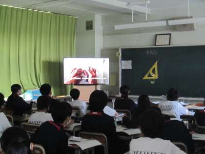 1年生 技術 等角図のかき方を教員手作りの動画を見ながら学んでいます。実際の手元の様子を見ることができるので分かりやすいと好評です。