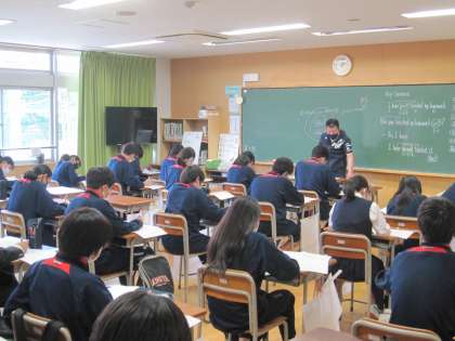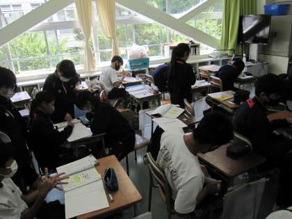 3年生 英語 スピーキングテストに向けての説明を受けていました。できるだけ簡単な表現で文を作ることがコツのようです。入試問題の英作文の傾向についても伝えていました。(副校長)
