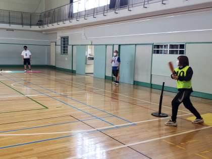 教員もメンバーに加わり、打席に立ちます。ホームラン1を狙っているようです。さぁ守備側は心して守ってくださいね。