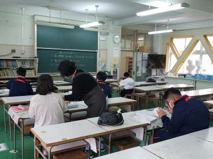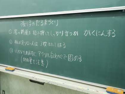張り子のだるまづくりです。紙を貼って糊で固めて、白い絵の具を塗っていきます。だるまづくりですが、もちろん作品はだるまでなくても構いません。ある生徒はフクロウにしようか、猫にしようか思案していました。イメージを様々に膨らませていくことが大切ですね。
