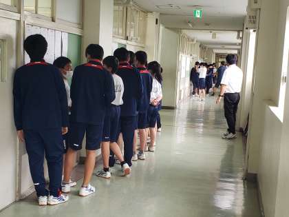 廊下で生徒が列をつくっています。なんだかウキウキしているみたいですね。何の列でしょう?