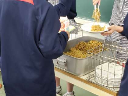 給食の焼きそばの配膳を待つ列でした。ウキウキしているはずですね。