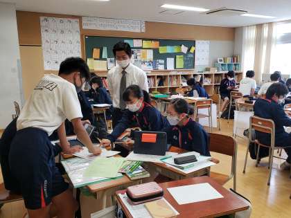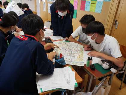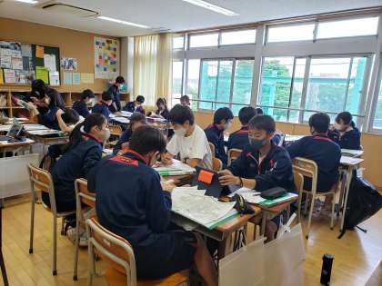 3年生、進路説明会の後は修学旅行の班別行動コース選定作業です。ネットで検索したり、地図で位置関係を把握したり、8月の修学旅行に向けて取り組んでいます。モチベーションも高く、楽しそうな班会議。この姿こそがこれからの学習理念でもある「主体的で対話的な深い学び」ですね。