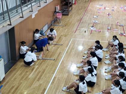 体力測定を行っていました。測定の仕方にもルールがあります。柔軟性は怪我の予防の上でも大切な体力の指標です。