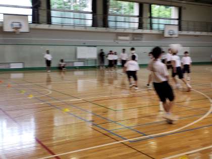 男子は測定が終わったようです。早く終わったのでソフトバレーボールを使ってのドッジボールをします、と先生から発病があると大喜びでした。いざゲームが始まると、迫力ある応酬が繰り広げられていました。