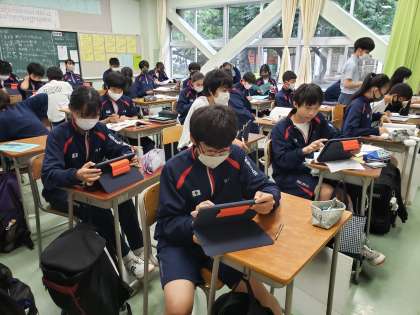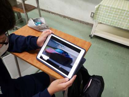 CMづくりに挑戦中。様々な画像や映像を組み合わせながら、オリジナルのCMを制作します。この作業を通じて、情報の受け手の立場からだけではなく、情報を発信する側の意図も実感していきます。誇大広告となってしまう背景なども知ることで、情報の受け手としての心構えも会得できるといいですね。