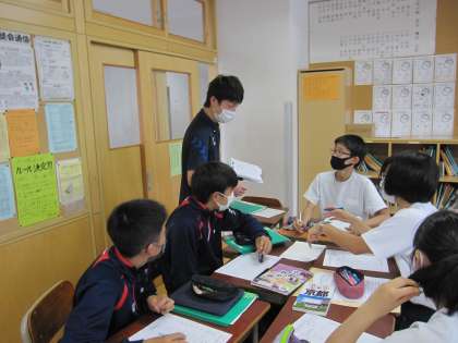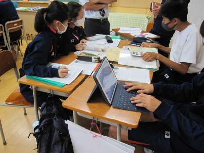 3年生が修学旅行2日目の班行動計画を立てています。地図や電車・バスの時刻表そしてタブレットを駆使しています。京都市内はバスが名所をつないでいるので、バスの時刻表をうまく使いこなすことがポイントとなりますね。「〇〇先生おすすめの場所だから絶対に行きたい。」「よくテレビで見るところだから行ってみたい。」という声が聞こえてきました。班の中で話し合いながら行先の調整を図っていました。(副校長)