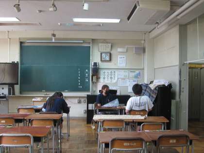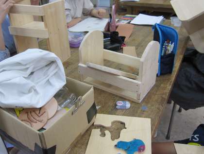 技術 本棚作りも仕上げに入っています。やすりで磨きをかけたり、飾りをつけたり、小さな棚をつけたりとオリジナルの工夫を凝らしていました。電動のこぎりやグラインダーなども使いこなしています。(副校長)