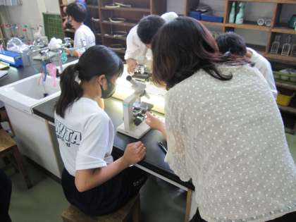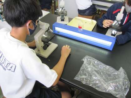 シダ植物の胞子を観察しています。顕微鏡は一人1台、プレパラートの準備もピント合わせも自分でやります。ピント合わせに苦労しつつも、見えた時はにっこり、「副校長先生も見てください!」と声をかけていただき、感動を共有させてもらいました。双眼実体顕微鏡では立体感もよくわかりました。(副校長)