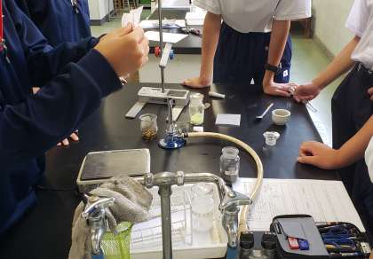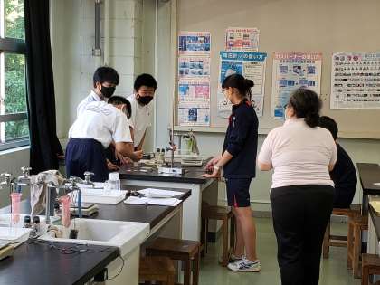 7時30分過ぎ、理科室に生徒が集まってきました。期末考査前の質問教室と実験の補習です。欠席等で実験に参加できなかった生徒や、もう一度手順を確認したい生徒が実験の補習に取り組んでいました。既に経験済みの生徒が先生役として、手順や安全対策を説明していました。朝から和やかな雰囲気の理科室です。