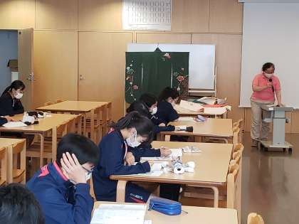 2年生は教科「日本語」と関連させて「和装」の学習です。実際の着物を見ながら、その機能性について考えています。なかなか和装をする機会はありませんが、学べば学ぶほど先人の知恵を実感することができますね。