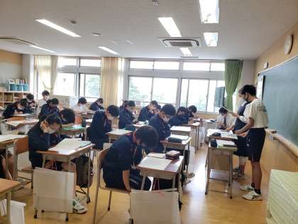 1年生は質問教室。教科担任が各クラスを巡回して、期末考査での疑問に答えています。人工知能搭載のタブレット教材「Qubena」に取り組んでいる生徒もいました。生徒の苦手な箇所を判断して、その生徒に応じた課題が提示されています。
