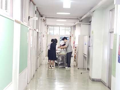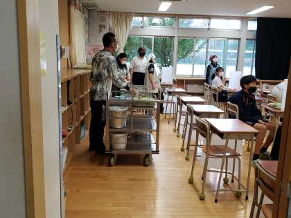 給食の時間です。今日はI組の配膳風景から。昨年度から感染症対策のため、教室を分かれての給食となっています。I組の強みは学年を越えての繋がりですが、給食の時間はしばらくこの状態が続きそうです。